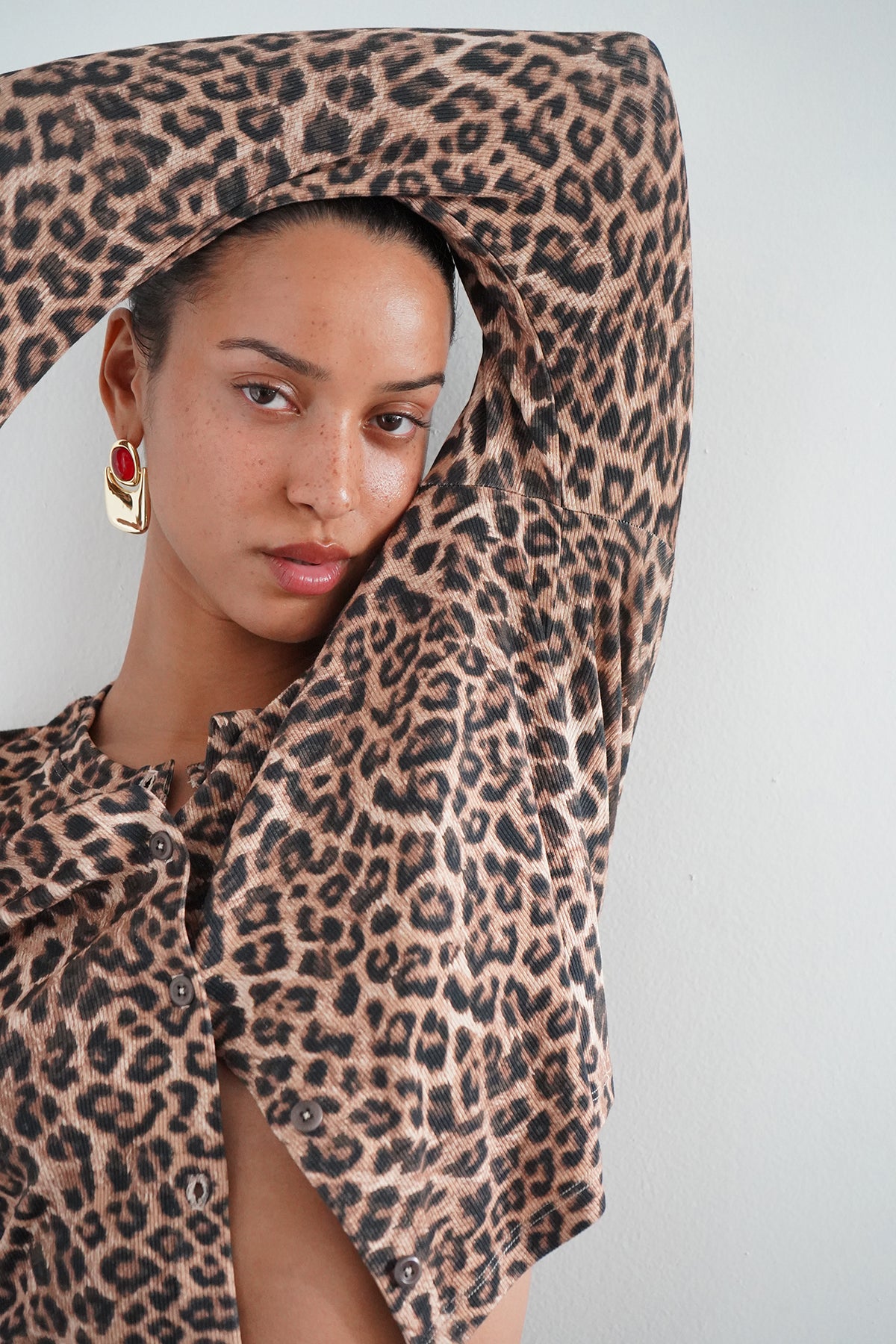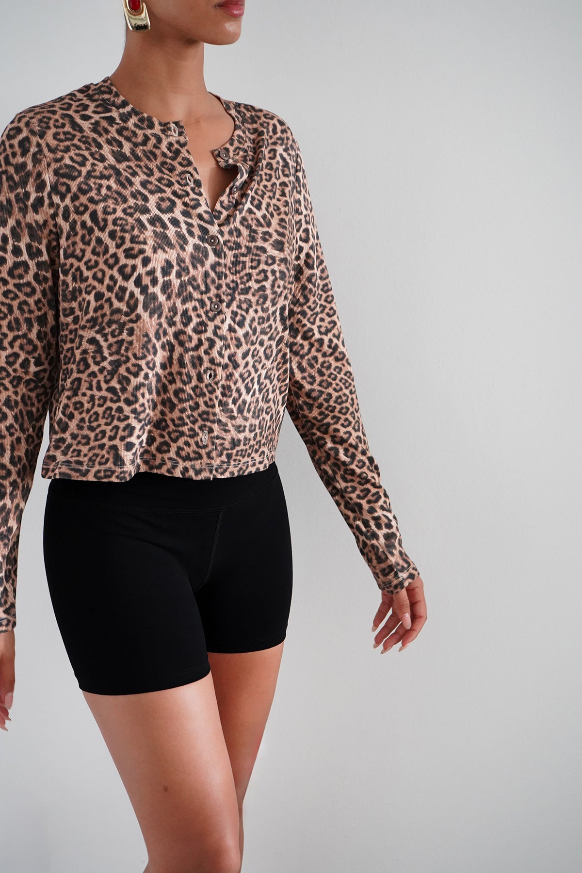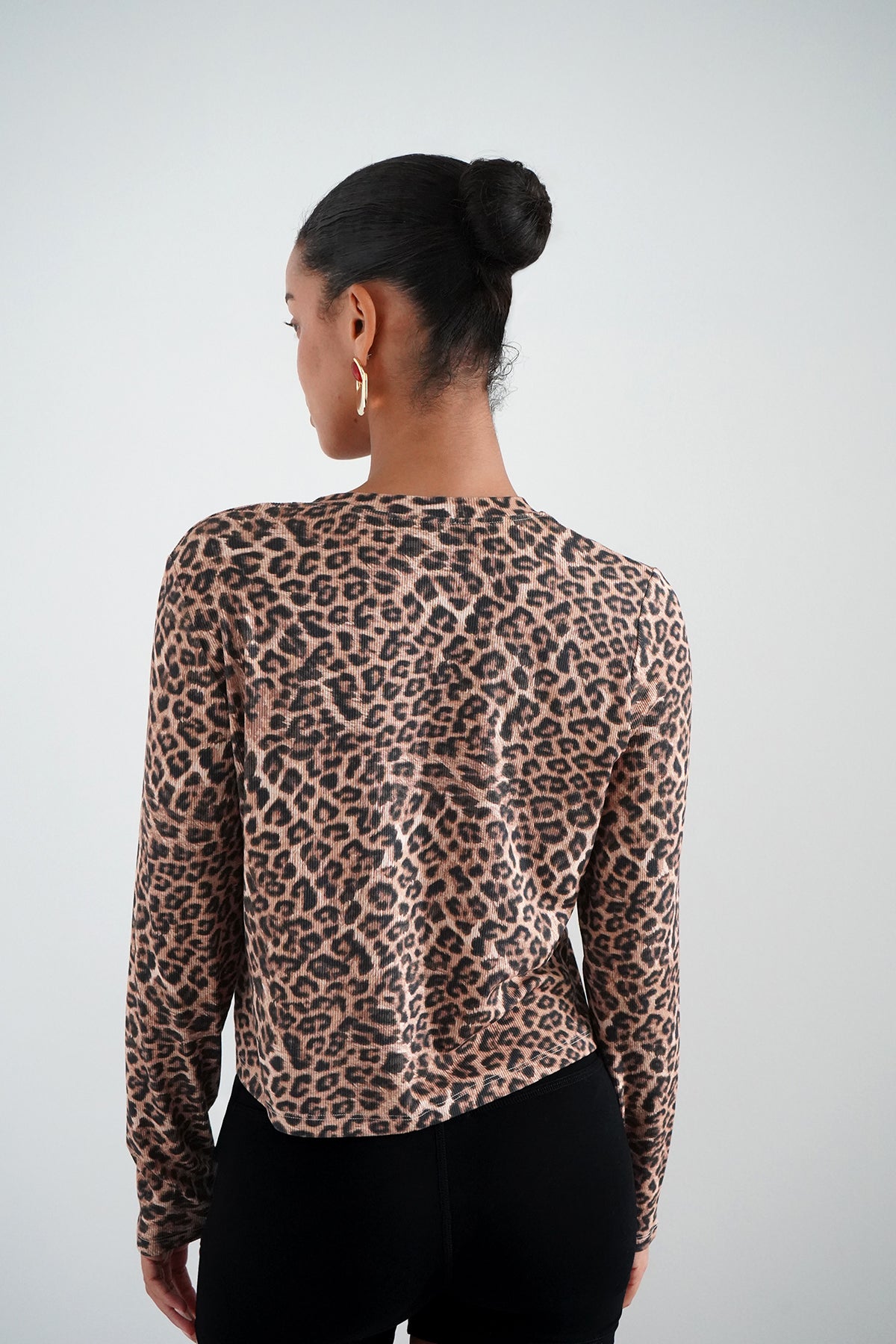 Mira is a leopard print 2x1 rib cardigan with a button front. This cardigan has a straight relaxed fit.