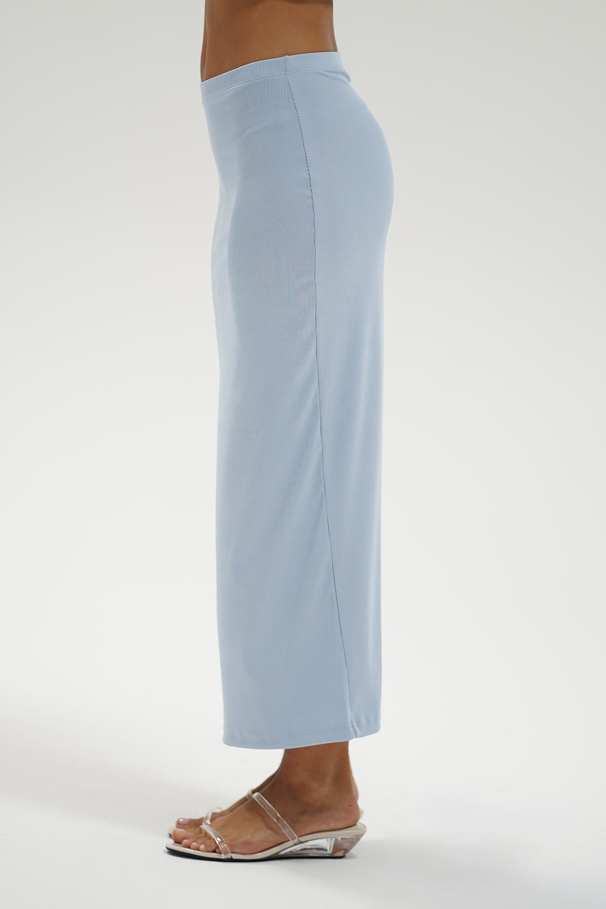 Slater is a pull on style skirt with one side slit. This skirt is made in our shine 2x1 rib fabric.