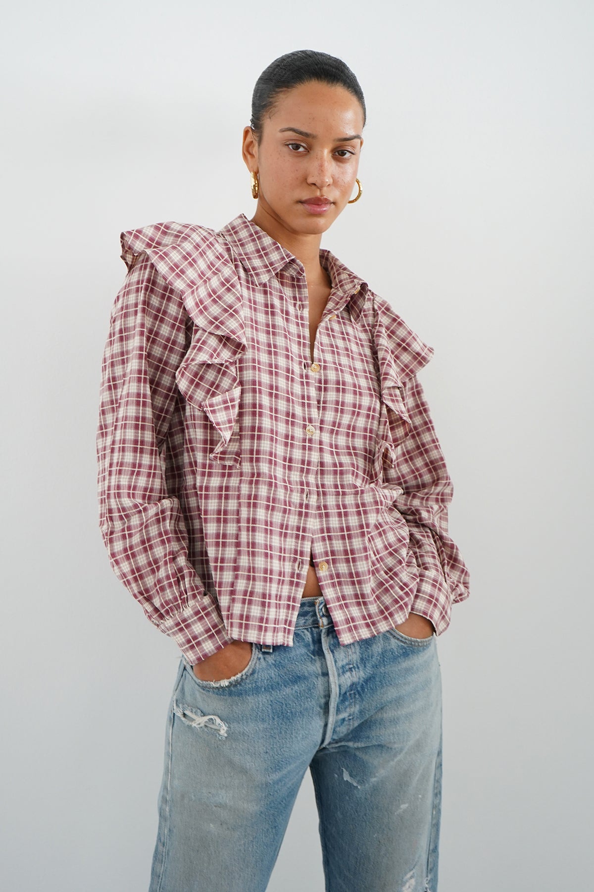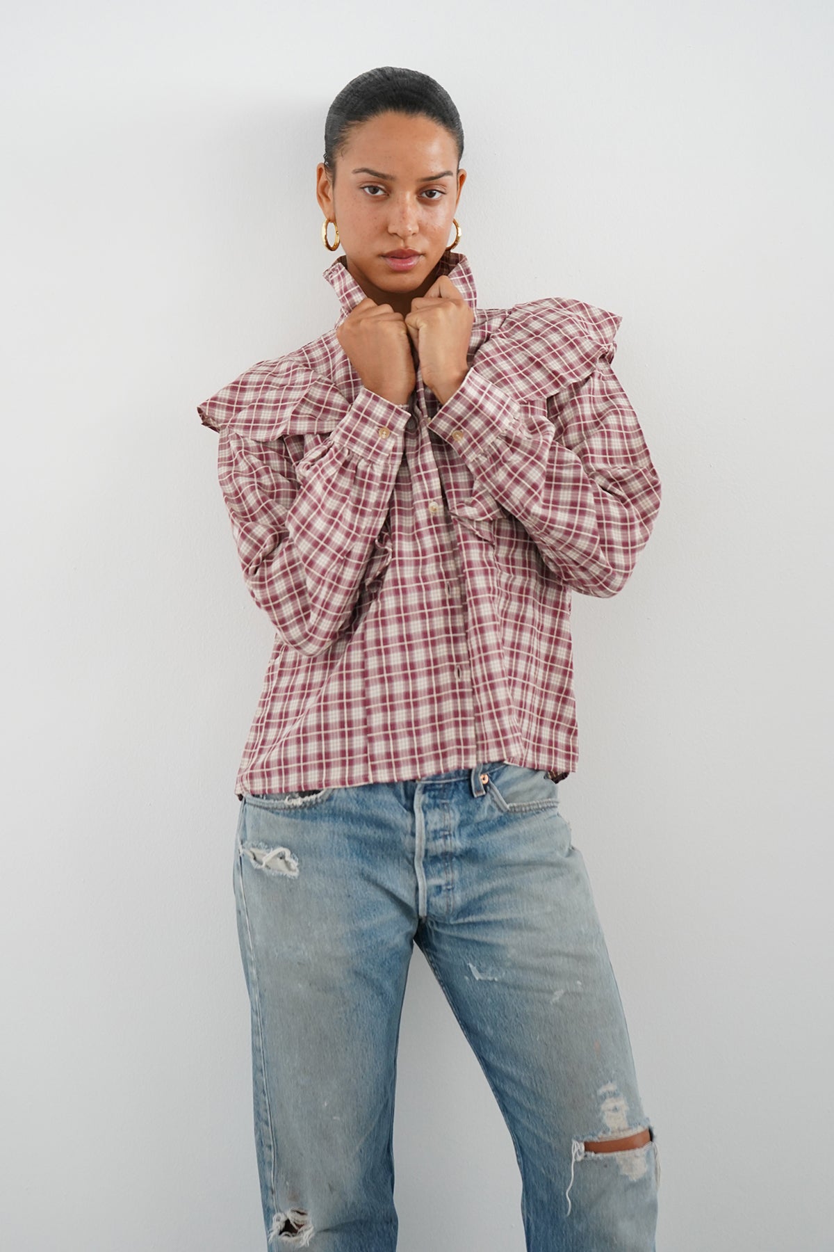 Dru Ruffle Front Blouse - Mulberry Plaid