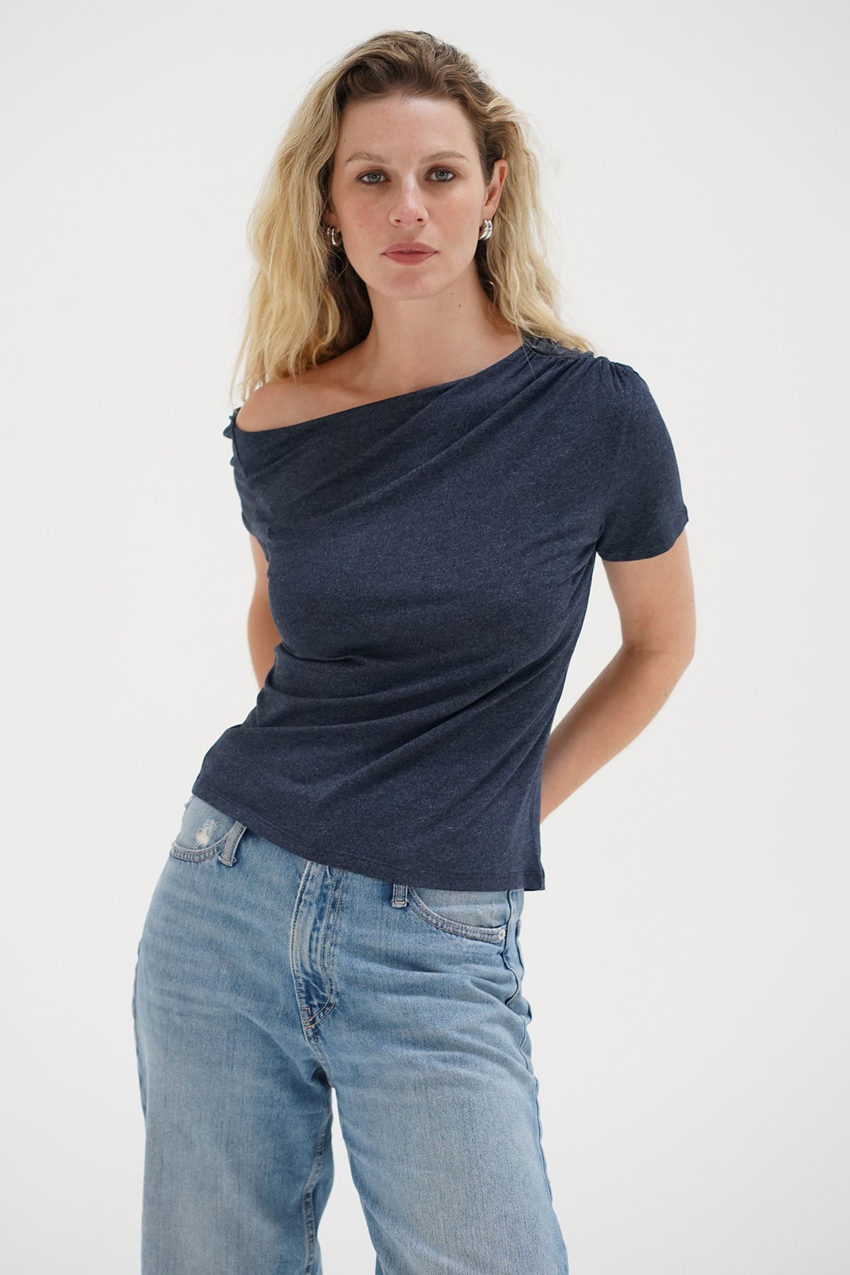 Rayne is a spandex jersey top with an asymmetrical gathered neckline.