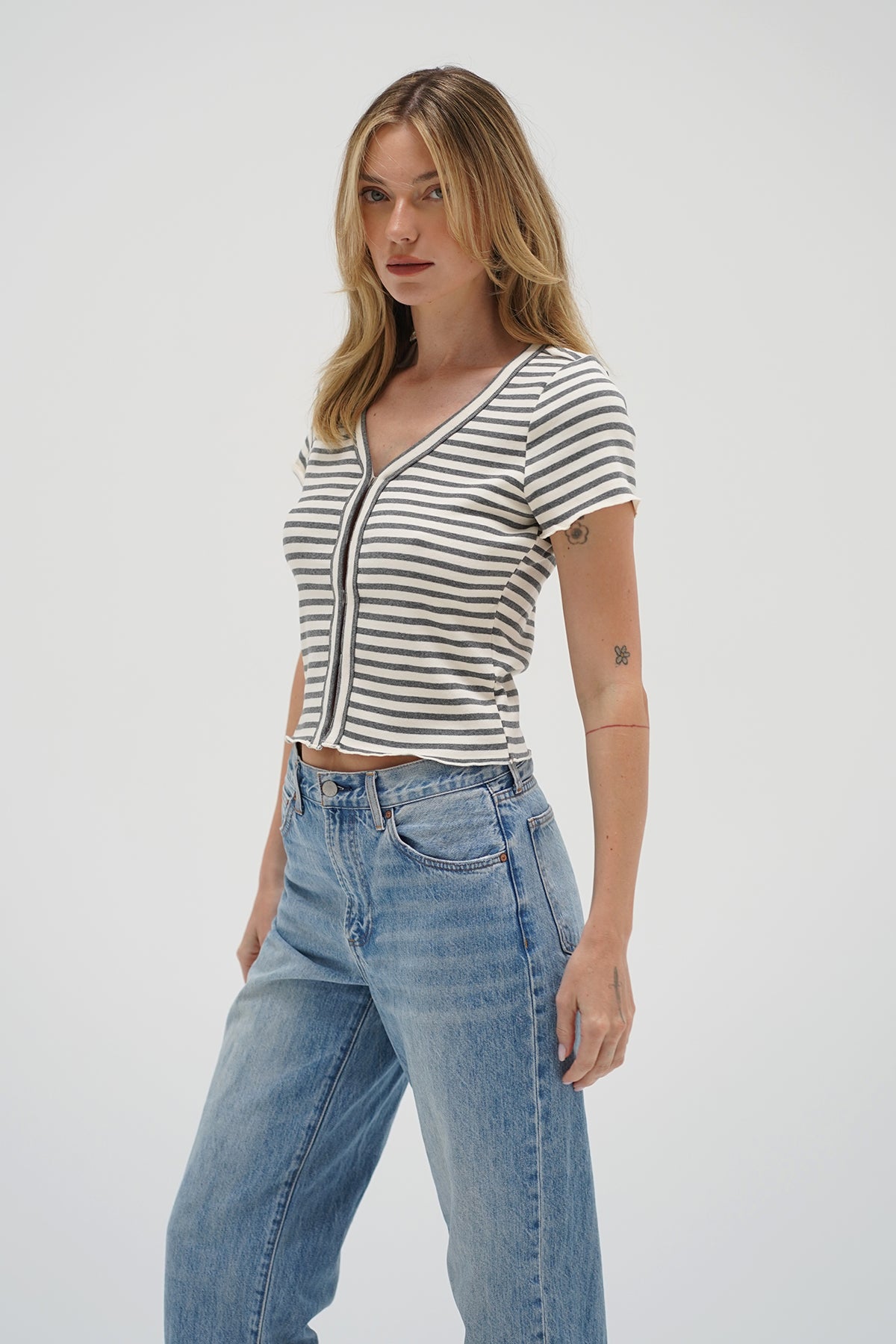 Ami is butter rib short sleeve tee with a metal hook and eye closure. This top is meant to hit top of pant.