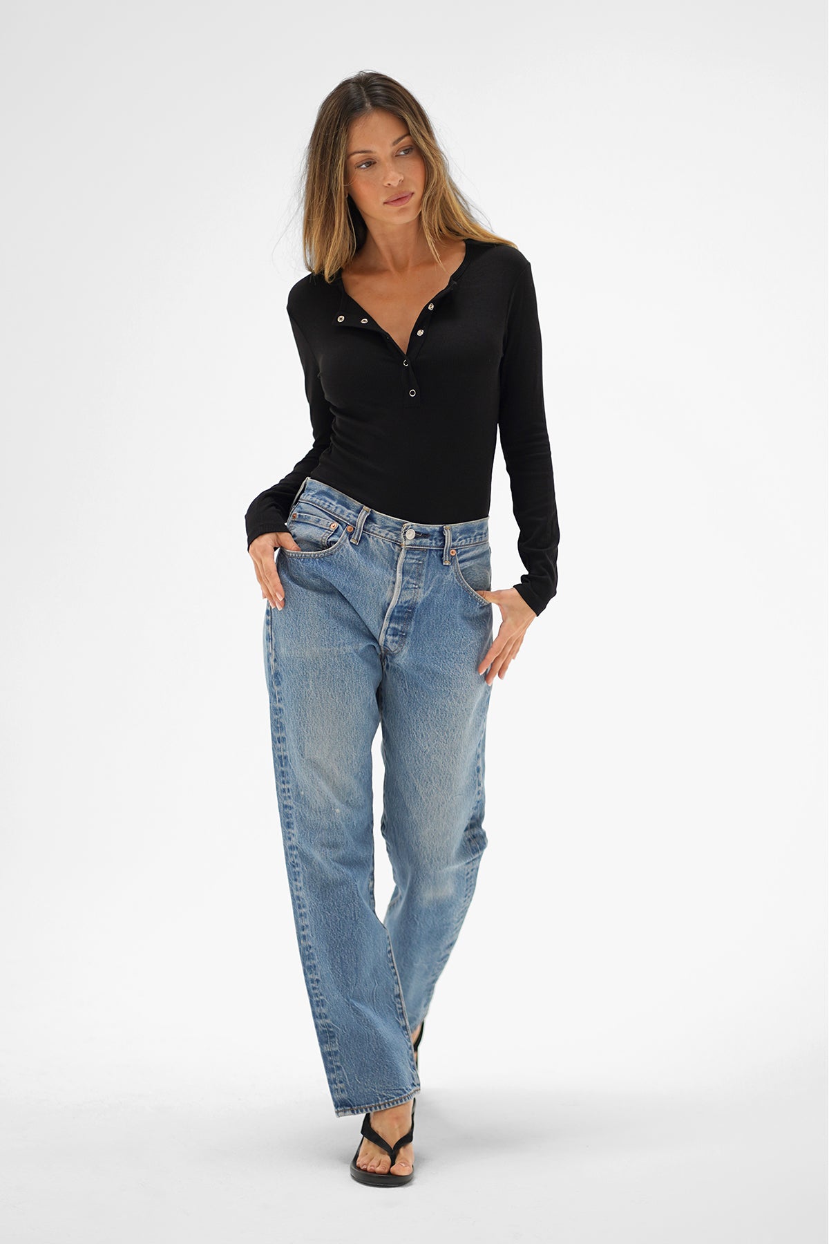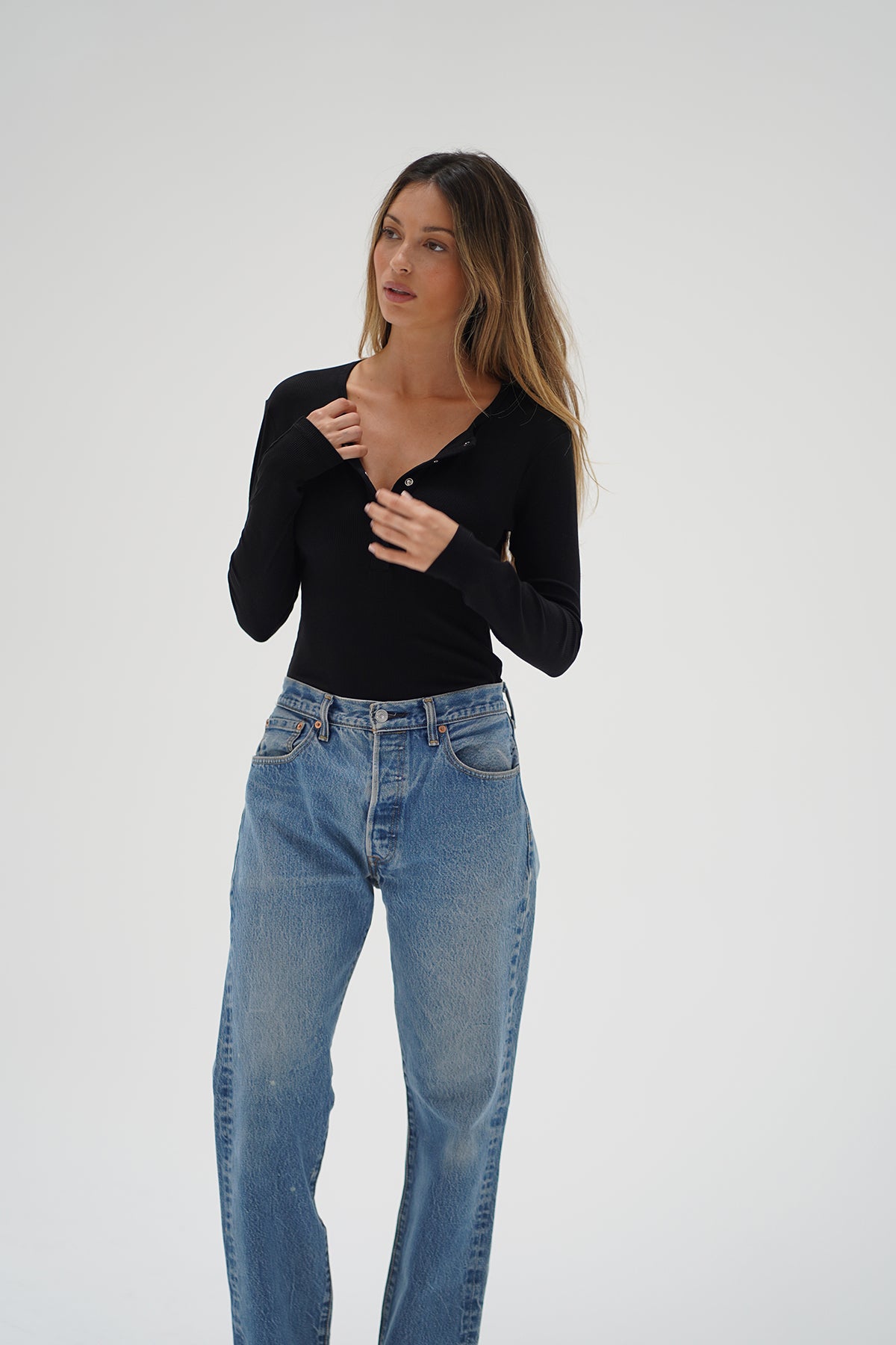 This Dalston is a 2x1 ribbed henley with a silver snap front. For a more fitted look, we recommend sizing down.