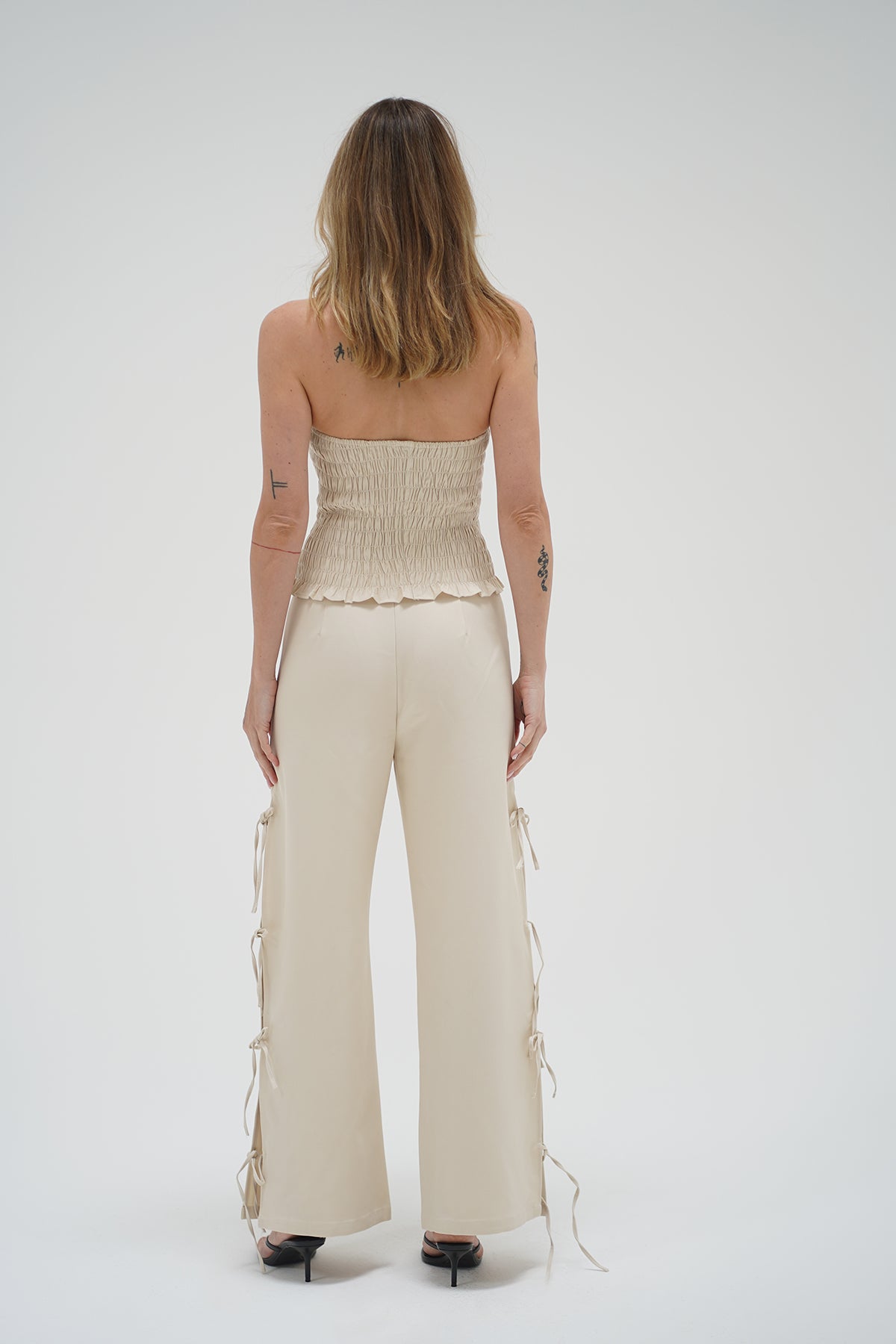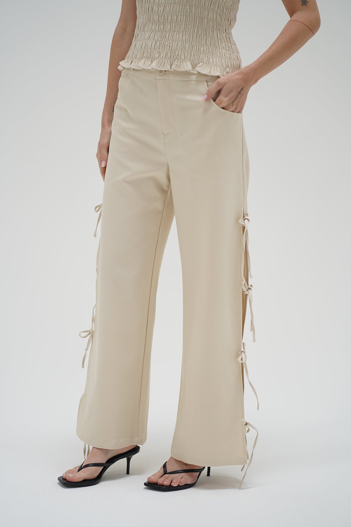 Delia is a straight fitting pants with a zip up fly and side pockets. This pant has tie closures from mid thigh down.