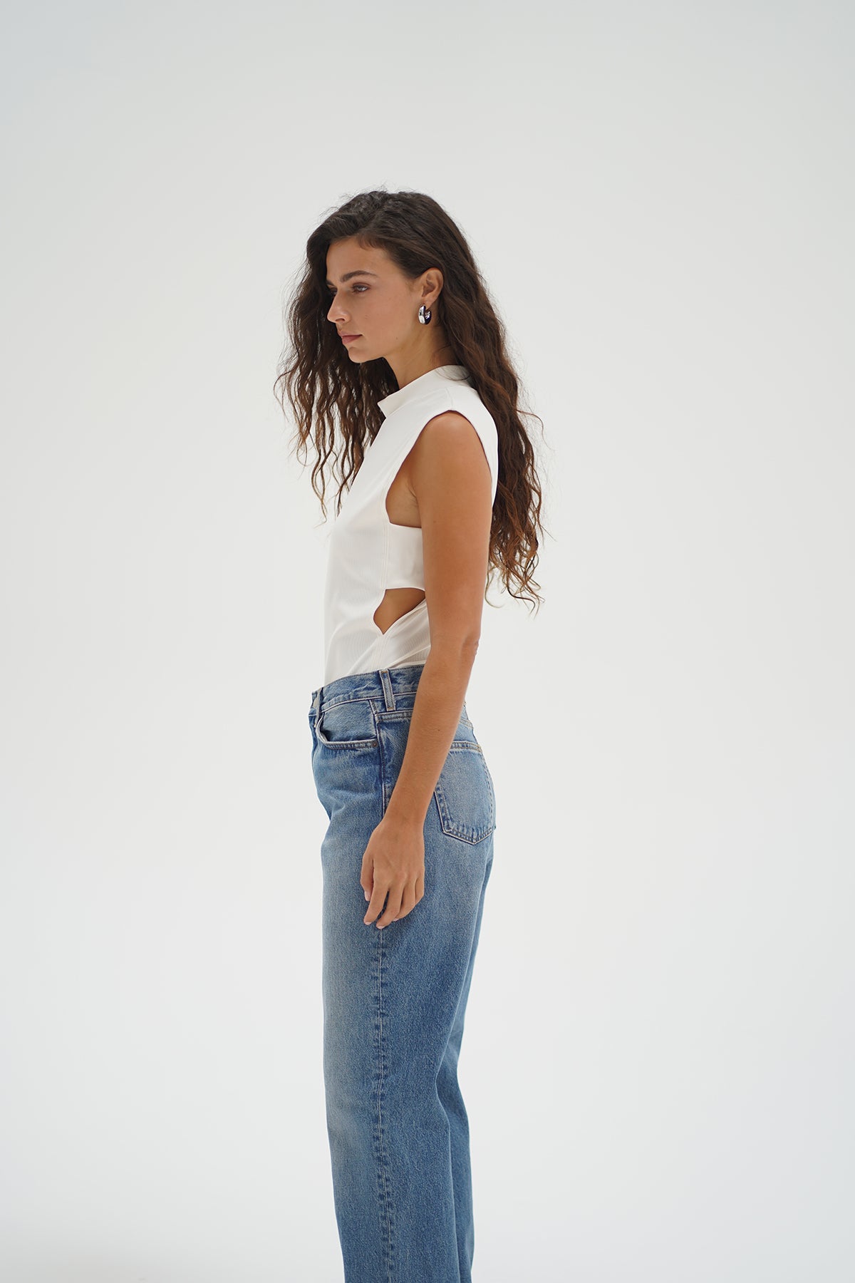 Jordy is a sleeveless top with side cut outs. This top is made in a shine 2x1 rib fabric that has a slight sheen to it.