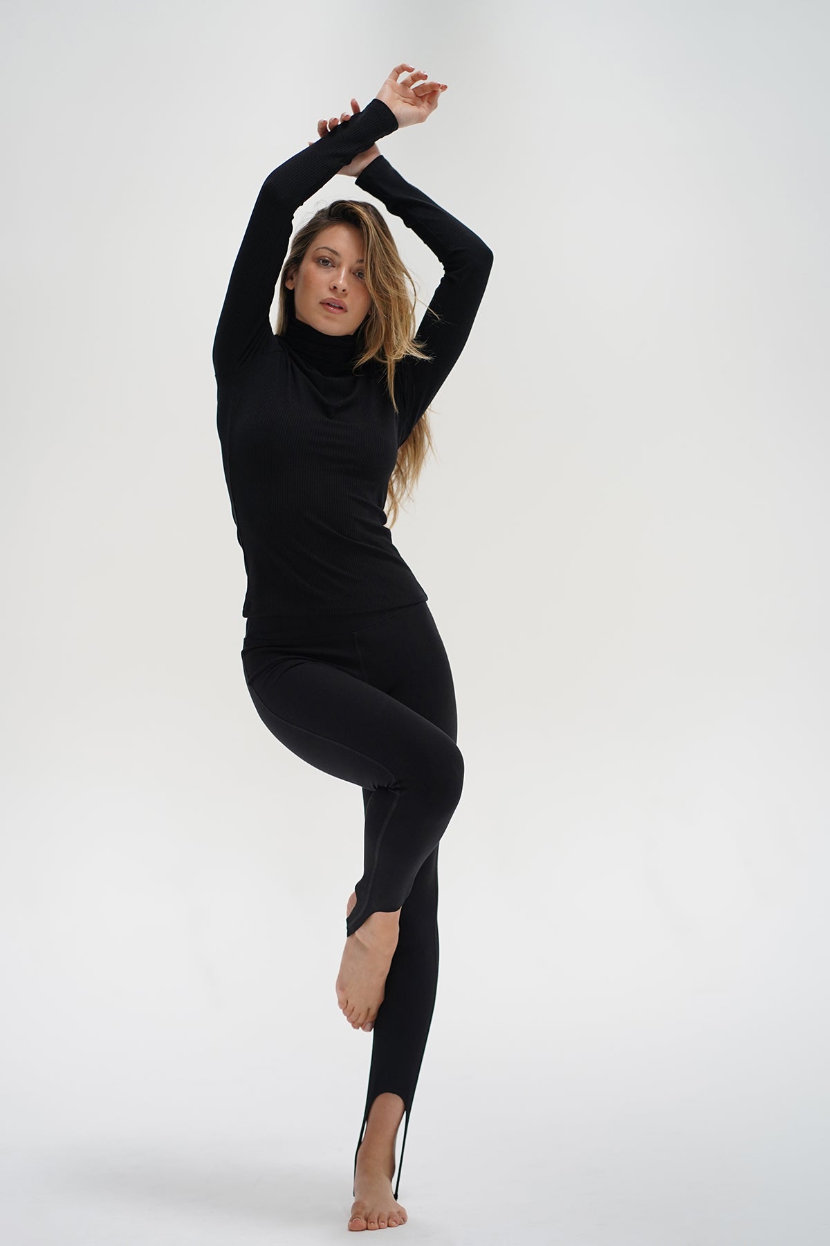 Miles is a high waisted cotton spandex legging with a stirrup foot strap.
