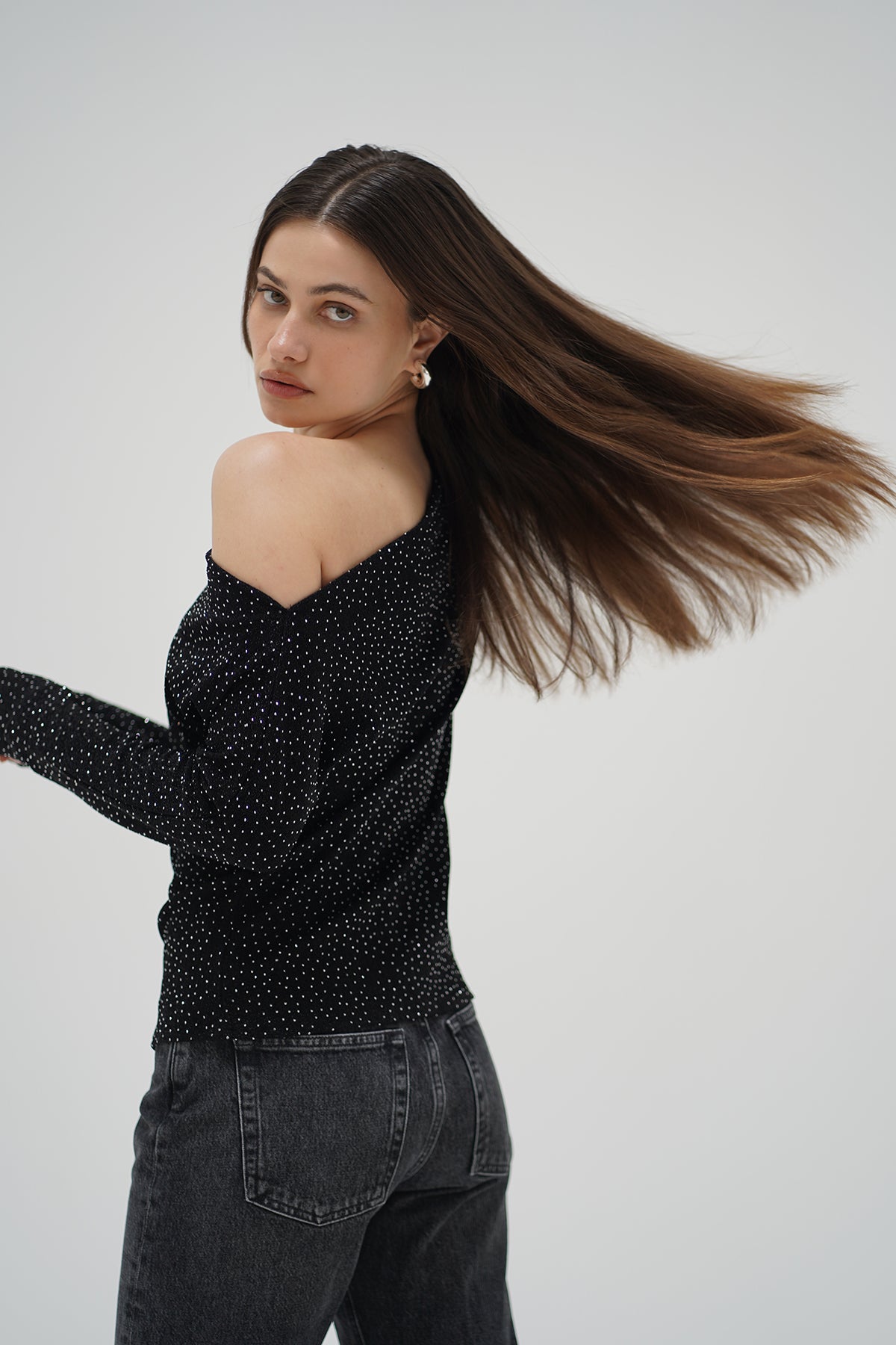 Odette is an off the shoulder long sleeve top made in a sparkle studded fabric.