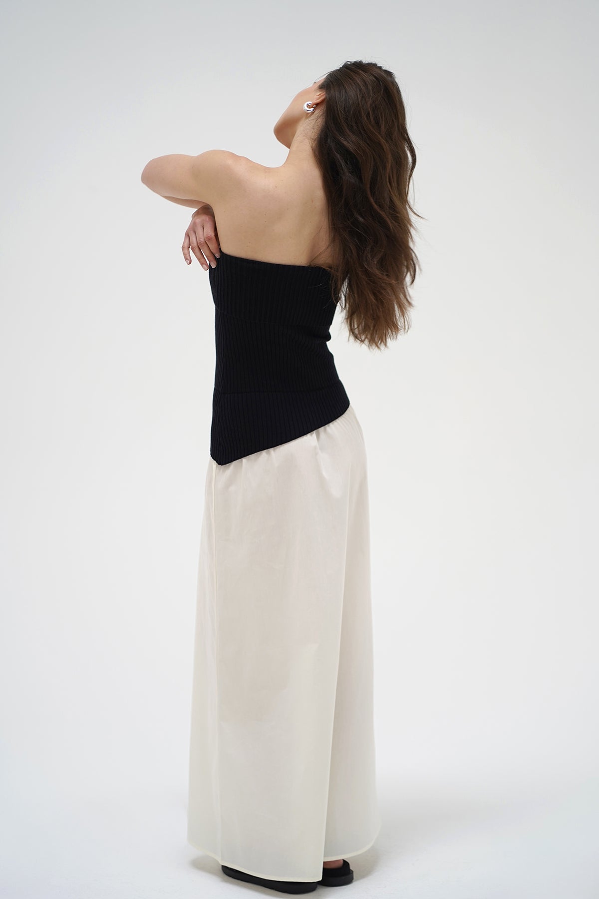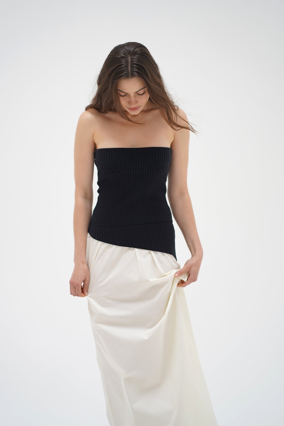 Roen is a strapless dress with a sweater knit top and cotton woven bottom.