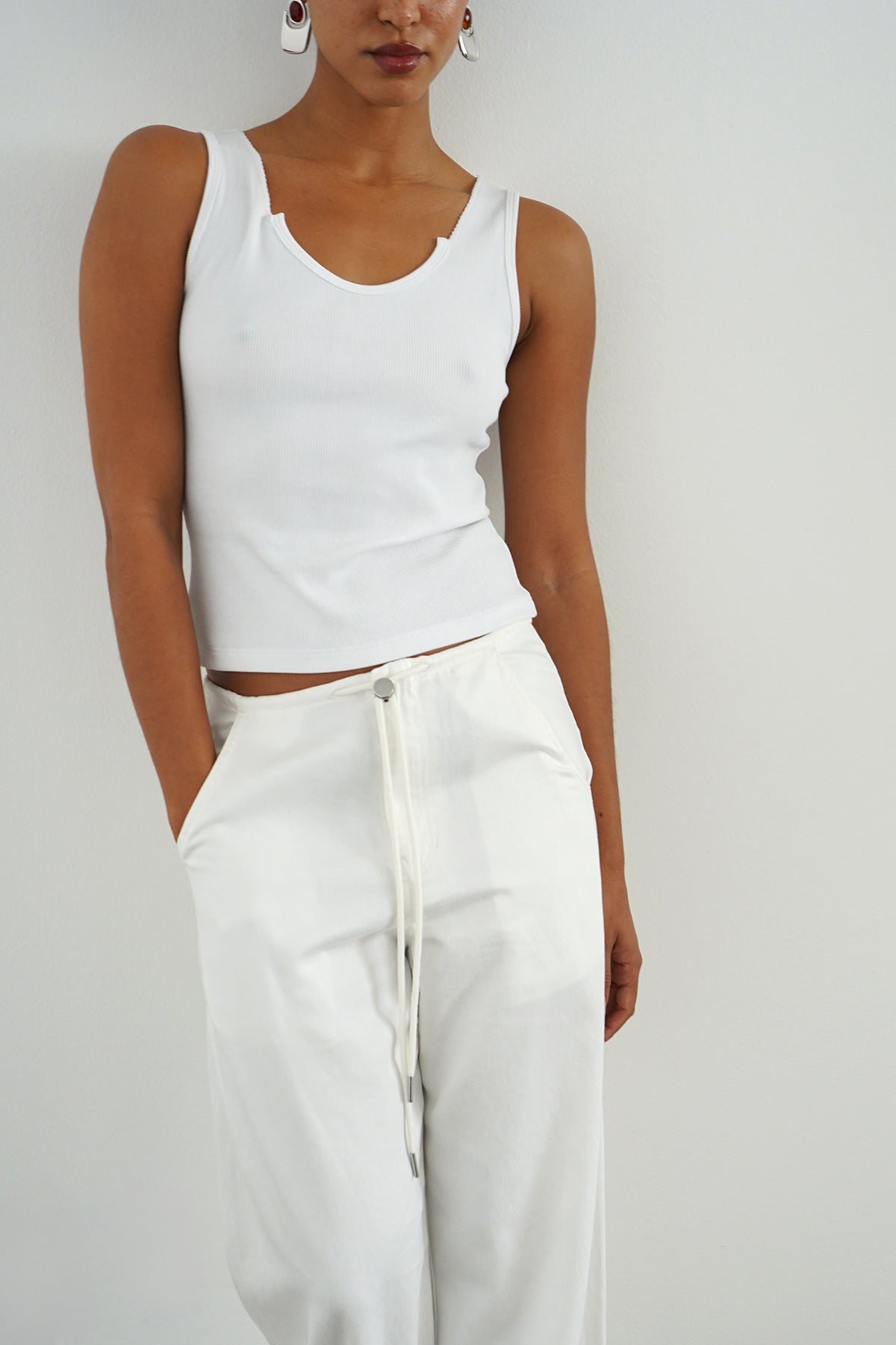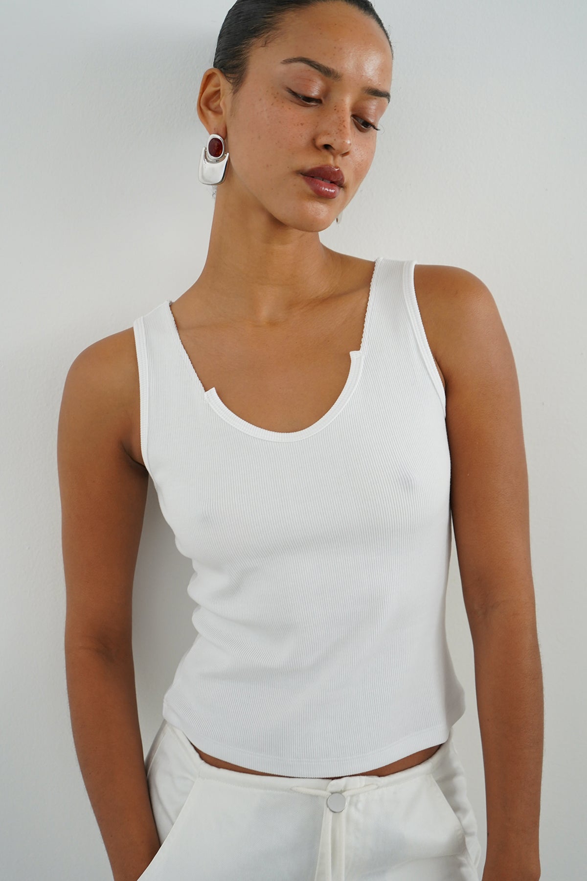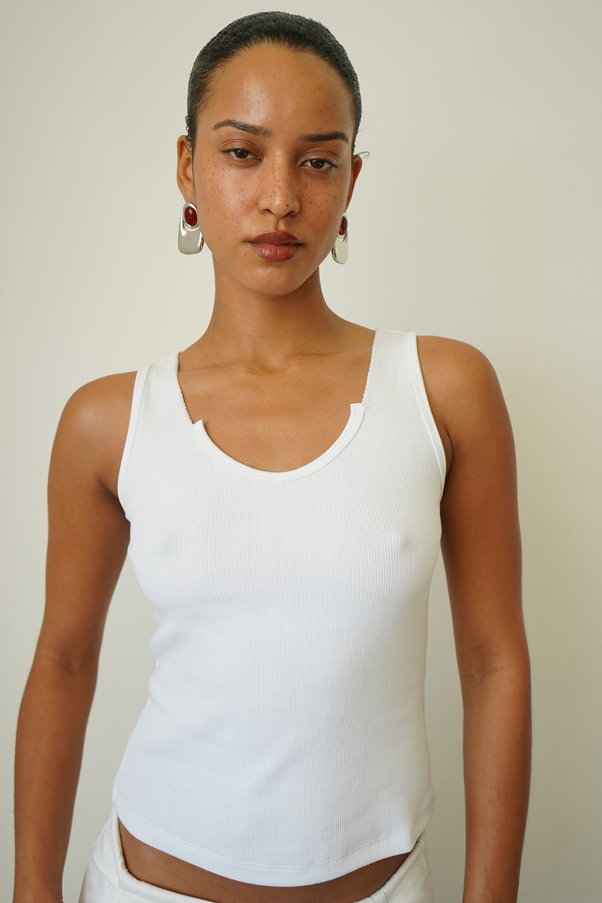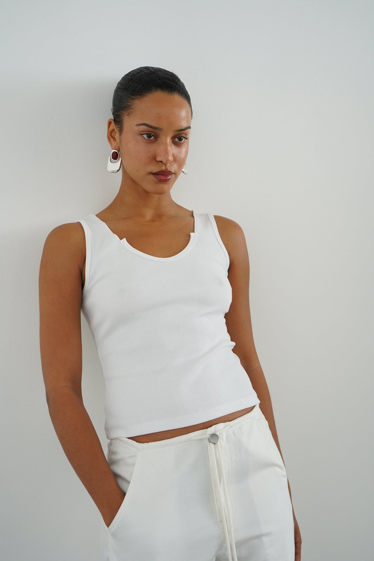 Ruben is a ribbed tank with a u neck line and raw finish.