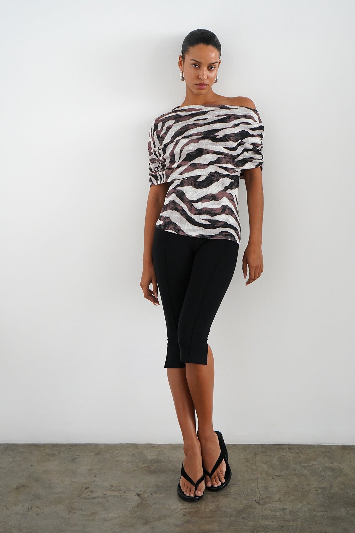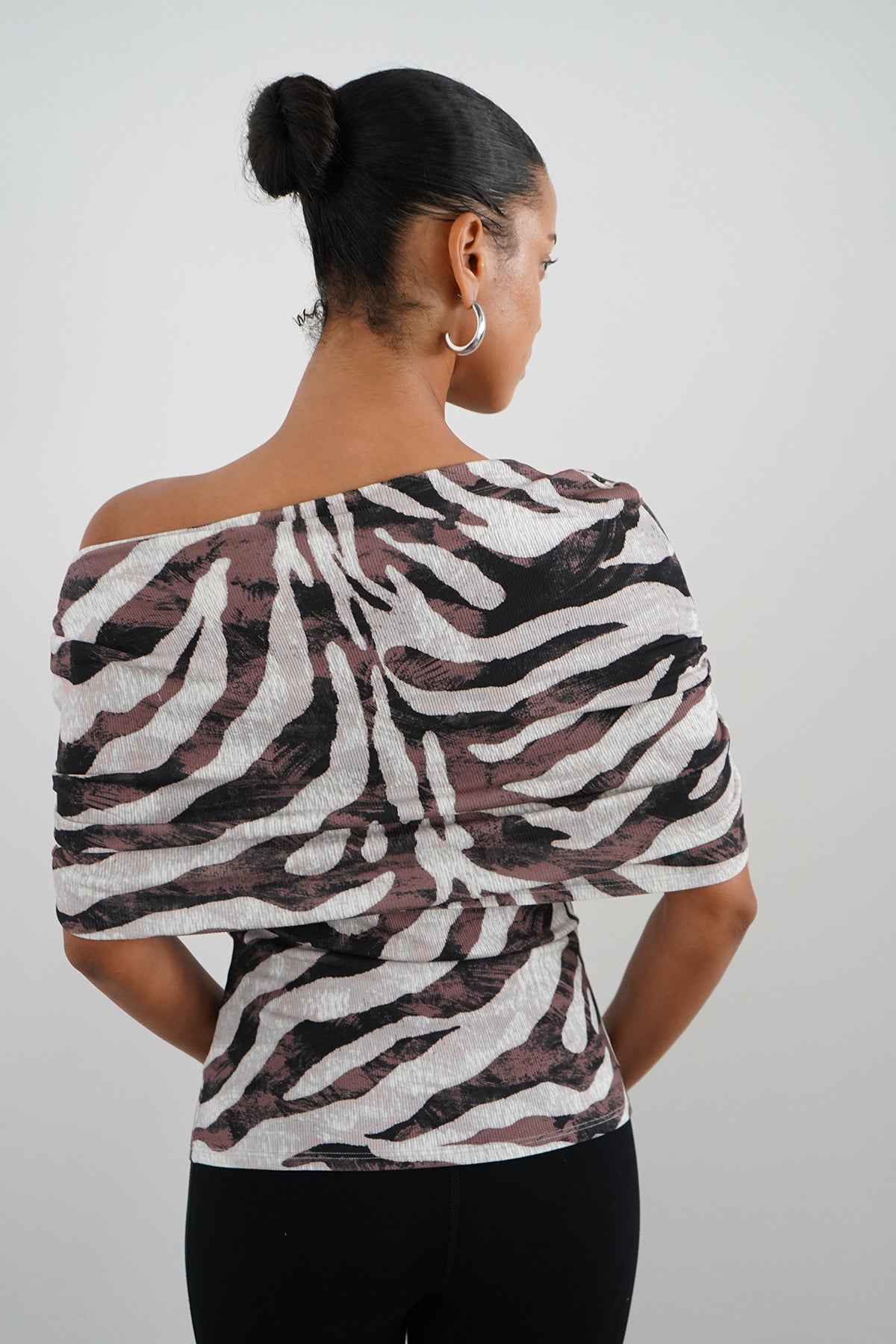 A 2x1 ribbed gathered fold over shawl top that can be worn off the shoulder.